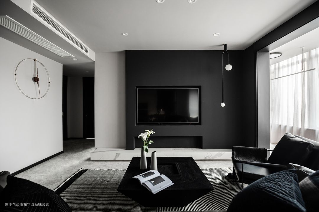 一张几何立方体的黑色茶几,仿佛一件艺术品,电视墙没有做过多的装饰,一整个黑色的背板,与吊顶的白色形成鲜明对比,黑与白,明与暗。下方做一个大理石地台,取代传统的电视柜,干净耐用易打扫。