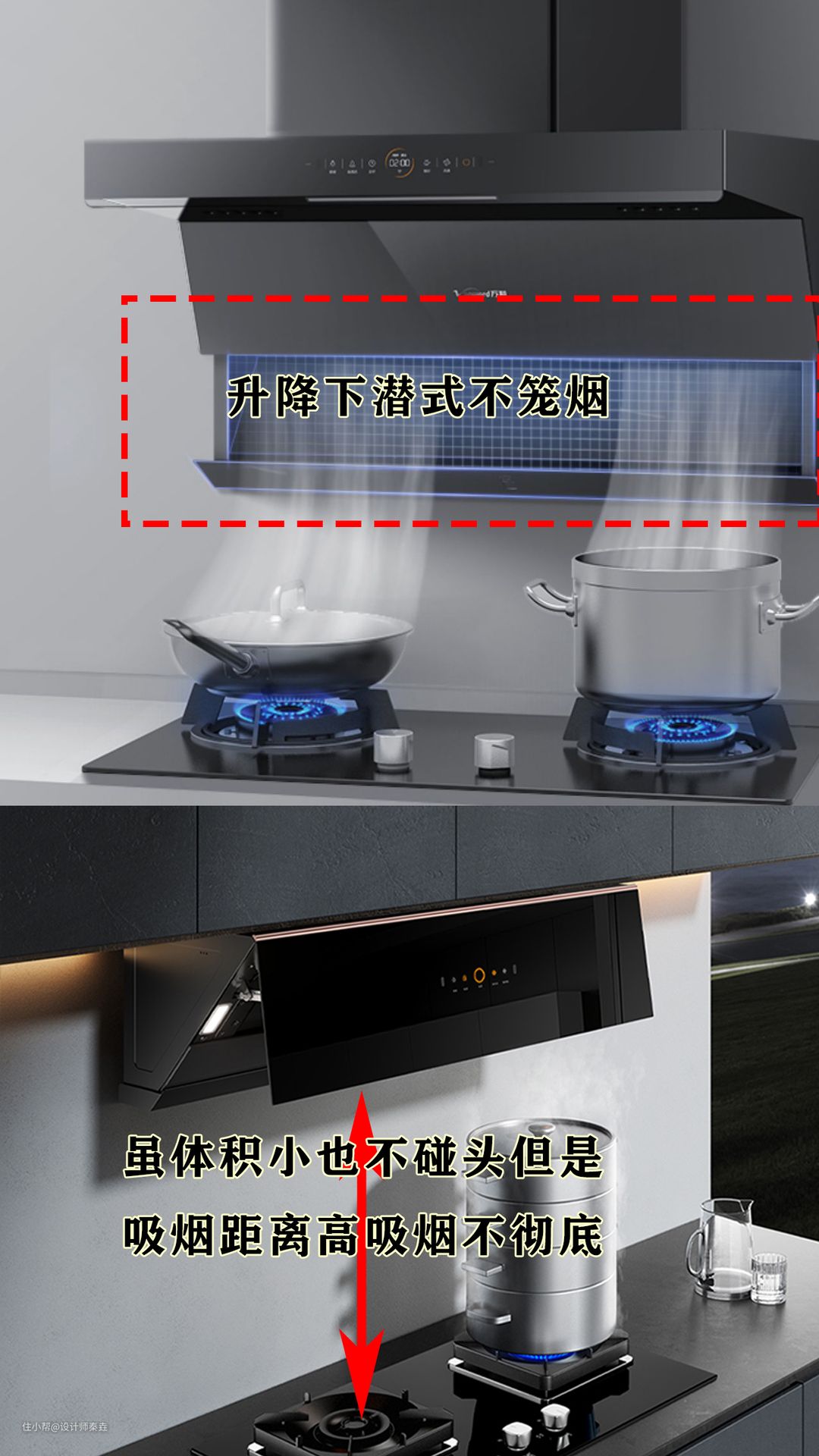 18年我的客户用了一款某帝的下潜式升降侧吸烟机,大致类似于下图第一款。去年他家里有了小孩,开始做饭才发现,这种烟机不笼烟爆炒时吸烟不彻底。下图第二款这类的也不推荐选择,烟机距离灶头太远,油烟密度大于空气,所以爆炒时油烟也容易四散。