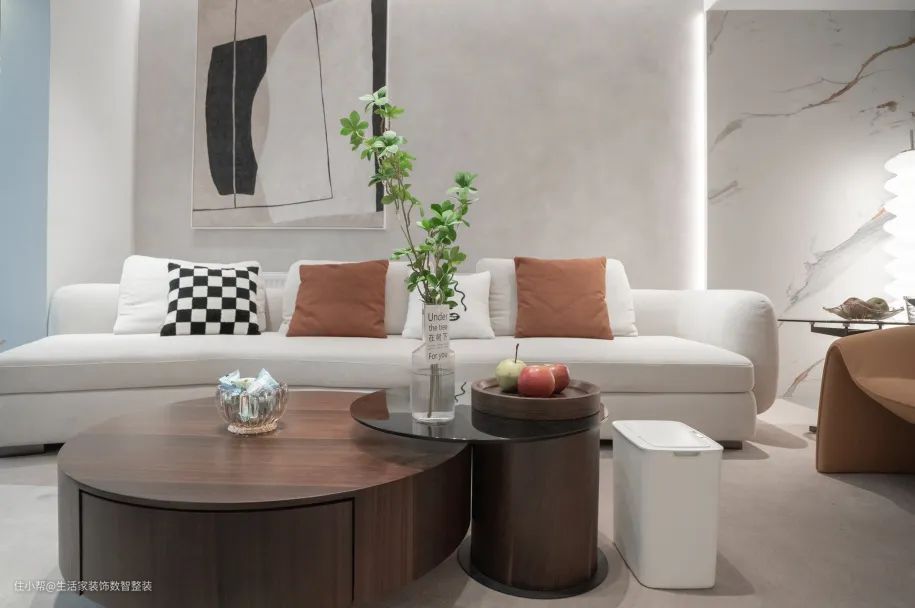 在沙发墙区域,设计师采用了艺术漆来装饰墙面,让纯白的空间多了一丝质感,搭配绒面沙发和橘色靠枕,更显温馨。家人们可以在这里聊天、观影,度过美好时光。