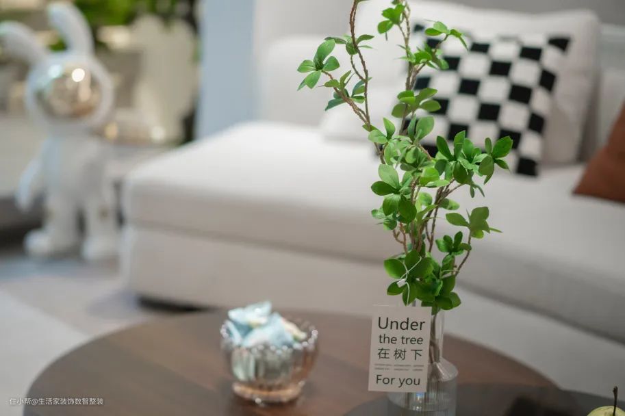 沙发左侧便是阳台,设计师在这里布置了一个开放的茶室,平时父母可以在这里喝茶看书。楼梯下方并没有打造为储物间,而是以绿植树木为景,让茶室更显幽静,营造舒适的氛围。