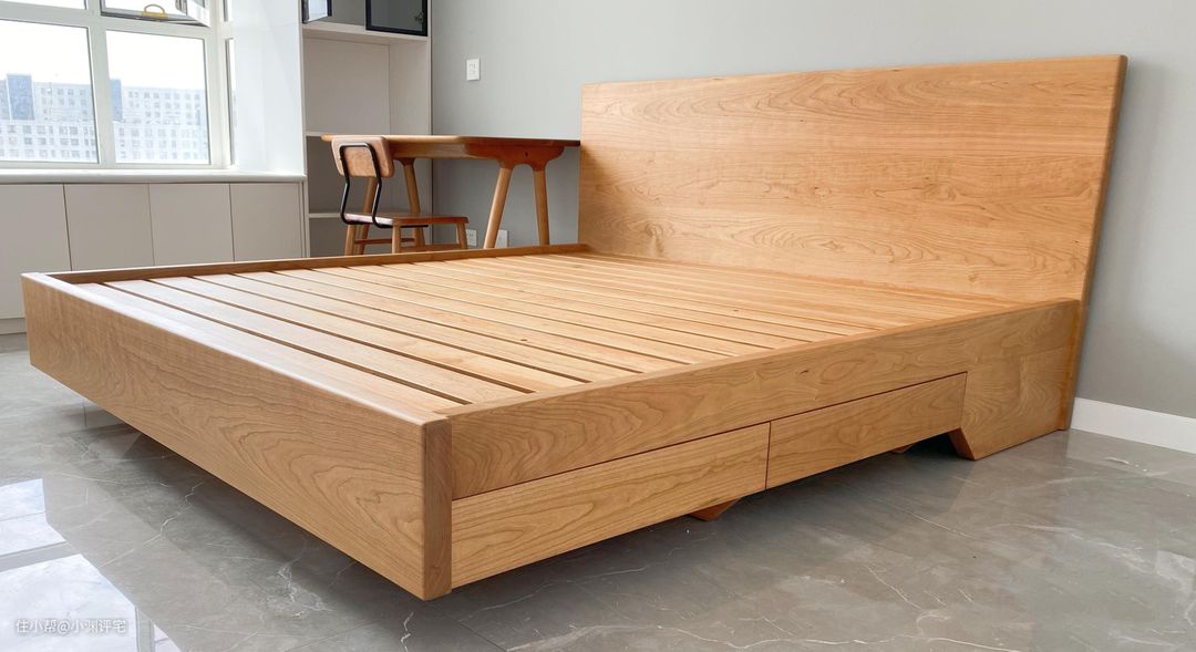 第一是架子床,完全没有床体,床板下面就是地面。这种床的底部空间很大,卫生最好做。但四个细高的床脚非常不结实,翻身的时候整张床都在晃。一个人睡还行,两个人的话不建议选架子床。