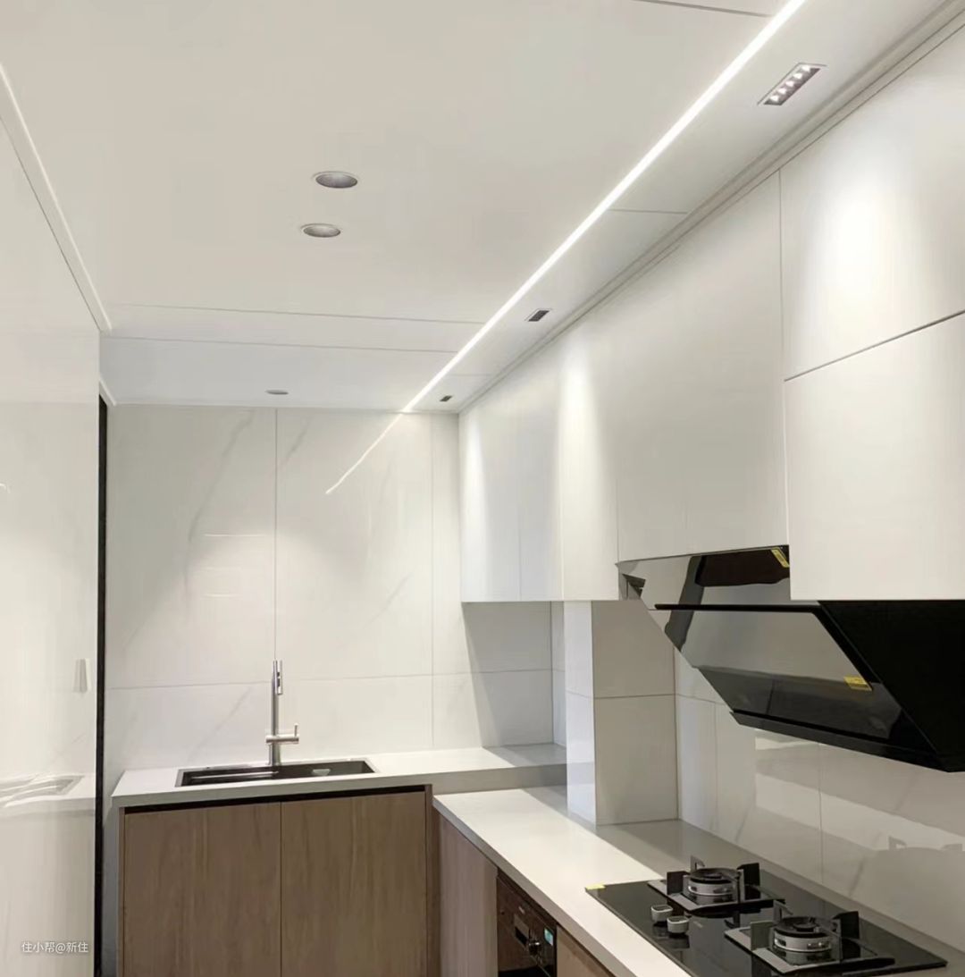 厨房里面,当时最满意的就是顶上的感应灯带设计,本想着做了这个灯带,能体验一把免开灯的便捷感,还能给家里带来科技时尚感。