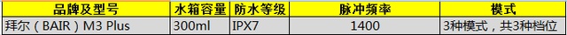 洁净能力:拜尔(BAIR)M3 Plus冲牙器的常规模式对全齿的表面污渍(粘稠面团)清理干净的时间为7秒,脉冲模式为8秒、轻柔模式为11秒。常规模式对牙缝中的残留物(紫菜)的的清理干净的时间为11秒,脉冲模式为13秒、轻柔模式为16秒。