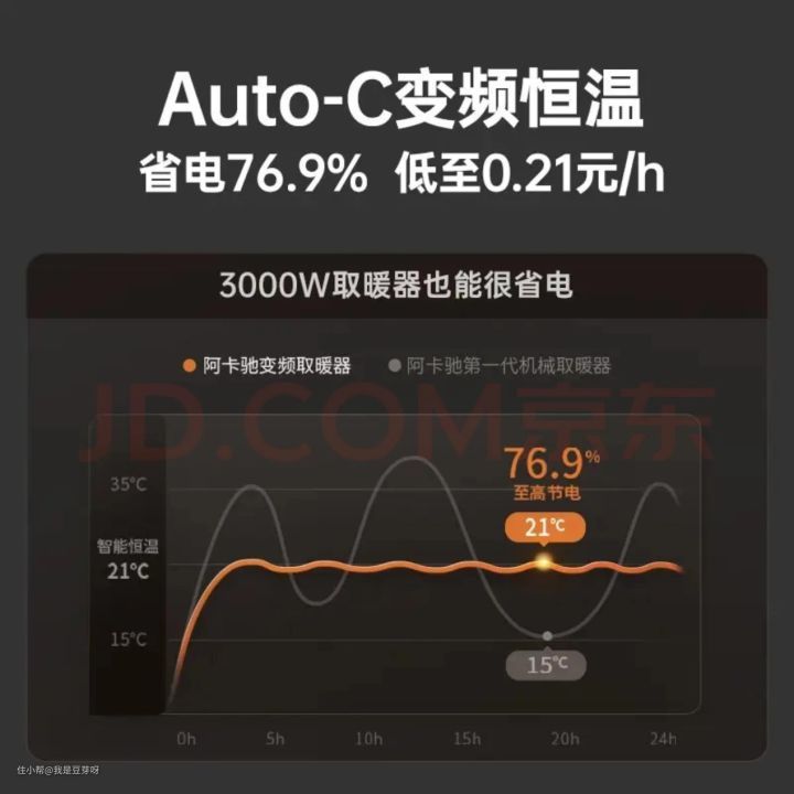 Auto-C智能变频恒温,低至0.21元/h,冬日取暖自由。不管是用什么家用电器,大家都非常关心能不能省电,阿卡驰也帮大家想到了这个问题。采用了Auto-C智能变频恒温技术,机器能做到智能感温,实时自动调整运行功率,实时补偿热量,达到24h全屋恒温,恒温状态下更加节能省电。对比一代阿卡驰取暖器最高节电76.9%,低至0.21元/h。