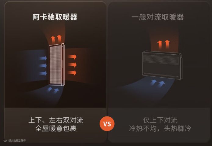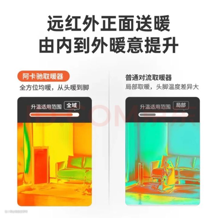贯流加快升温,不闷不燥。一般的对流式取暖器利用空气流动性原理,让冷热空气上下对流,这样升温速度很慢,并且会出现头热脚冷的情况。 针对这个问题,阿卡驰创新的升级搭载双向贯流风机,通过 DD-C微压技术主动将空气推动循环,支持上下左右双对流立体循环,无死角取暖的同时有效降低了室内加热产生的闷压感。可以通过下面的对比图直观感受一下。