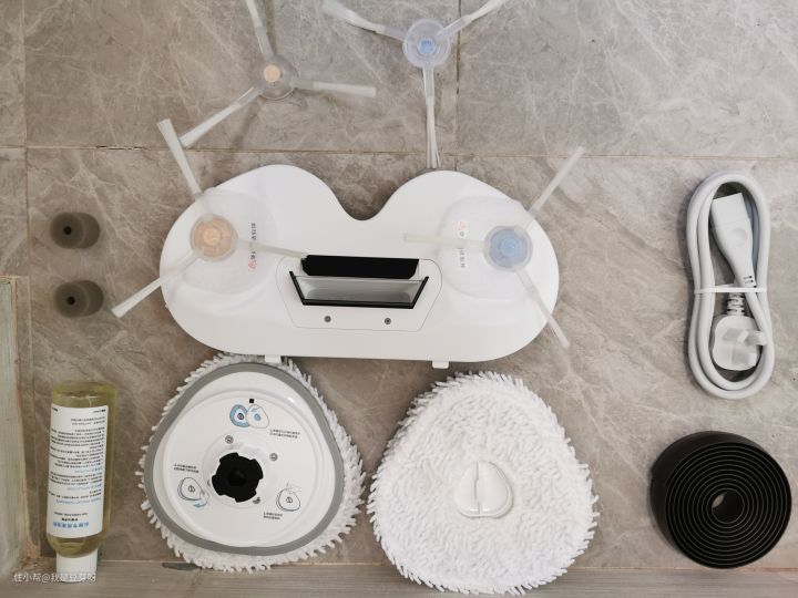打开箱子后,外观上,云鲸拖扫一体机器人采用的是通体白色的外壳,洁白圆润的拖地机器人在清洁时能够很好得融入家中的环境,如果你的家居装修是极简风格,有交相辉映的效果。