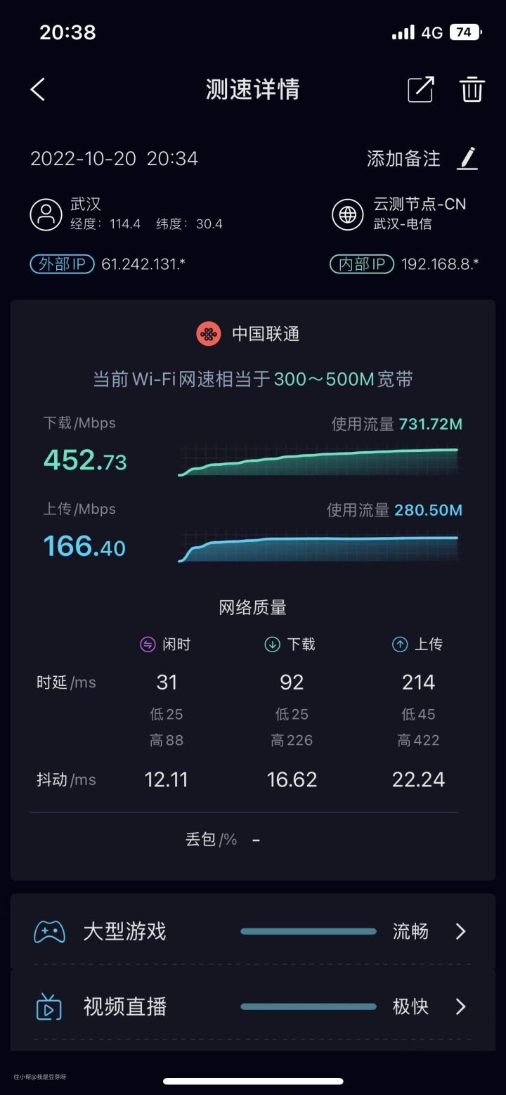 在面积为200平方米的咖啡厅,iPhone13连接烽火 5G CPE移动路由器测试网速,速度为:延迟31ms,下载速度452.73 Mbps,上传166.40Mbps。在这种网速下打游戏时也是非常流畅的、进行视频直播也是极快的。