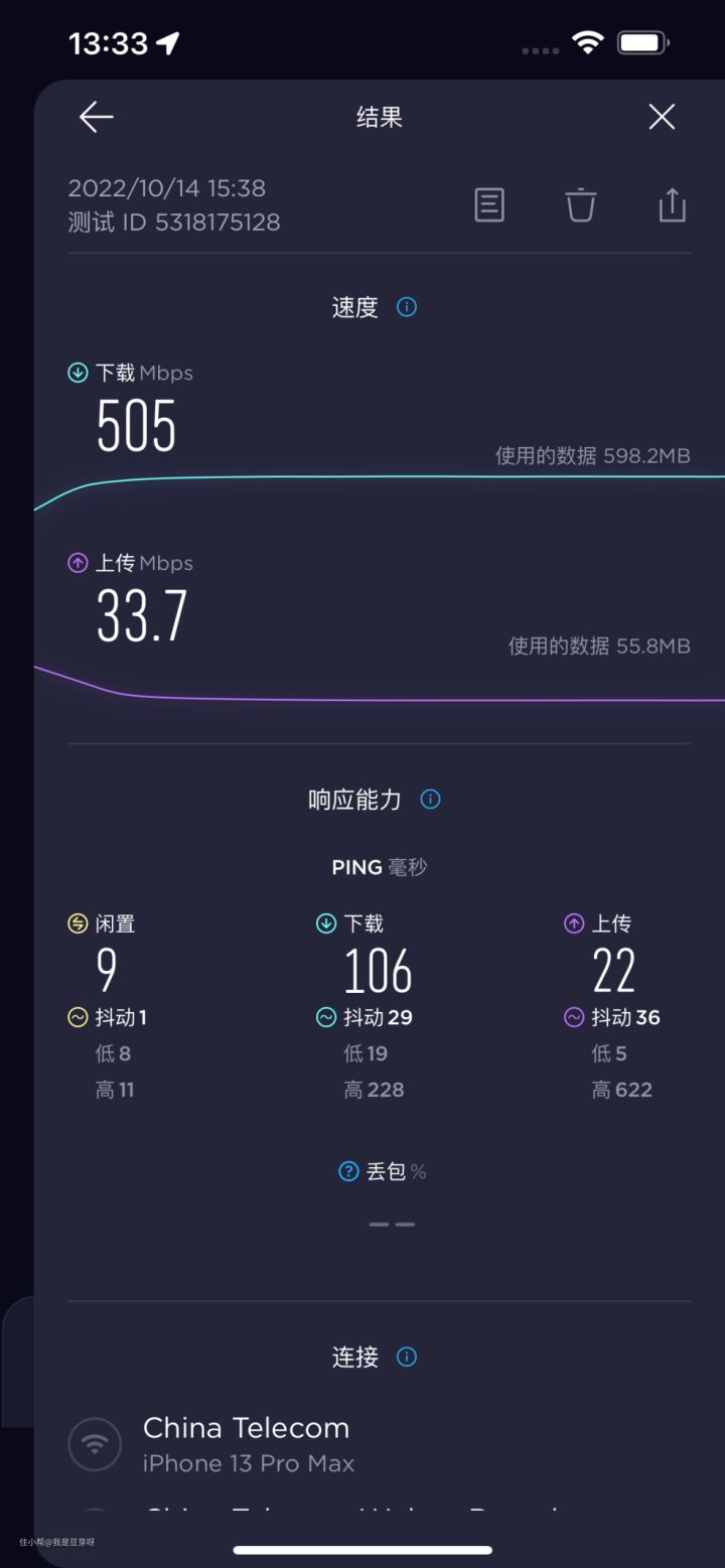 在我住的房间内,通过电脑连接烽火 5G CPE移动路由器后,可以看到烽火 5G CPE移动路由器在我的iPhone13Promax的下载速度505.00Mbps,上传33.7Mbps。