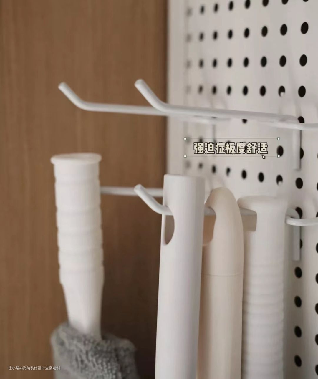 洞洞板是装修的时候就已经规划好的,量好尺寸定制打孔安装,直接将螺丝钉打进柜子背板,插头也是提前预留好,方便清洁工具充电。
