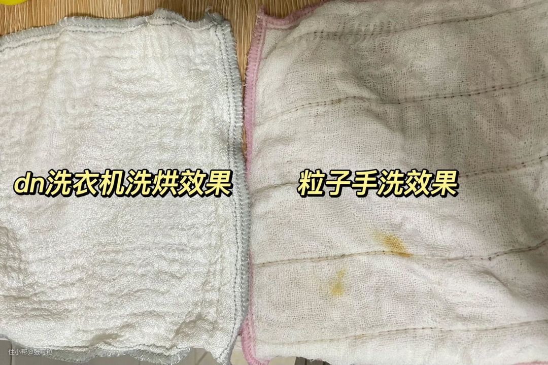 同样是抹布沾染了酱油渍、蚝油,左边用DN洗衣机洗烘完就白白净净的,右边就很难手洗干净。
