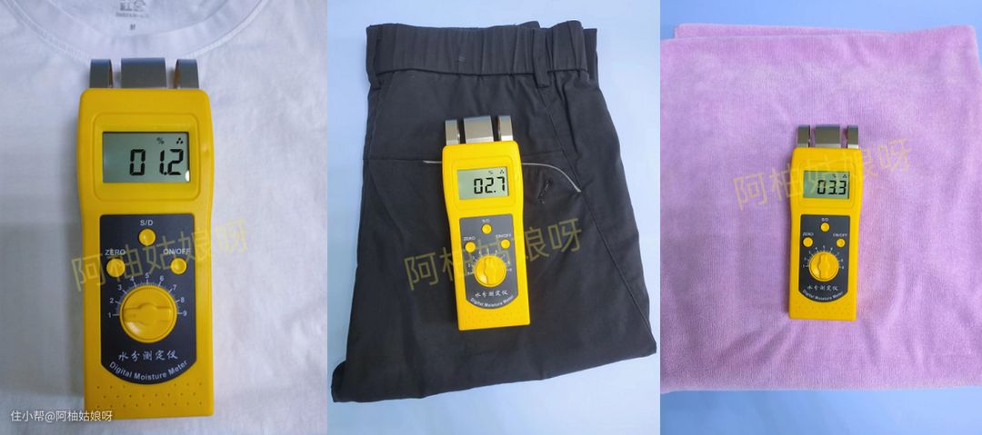 低温烘干最大的缺点就是烘不干,于是我拿了短袖、西裤、厚毛巾进行测试,看下这几件衣物烘干后的含水率是多少。