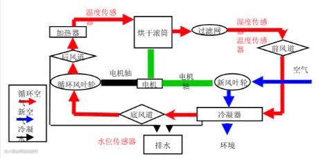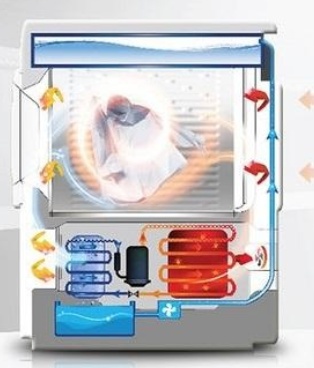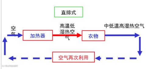 原理跟吹风机差不多,空气被吸入加热模块进行加热,然后干燥的热风把衣物的水分带走,然后变成湿热风排出机器外。 这种烘干方式结构简单,机型售价较低。缺点湿烘干效果不好,如果烘干较厚的衣物会出现外干内湿的情。并且烘干时间较长,噪音较大。