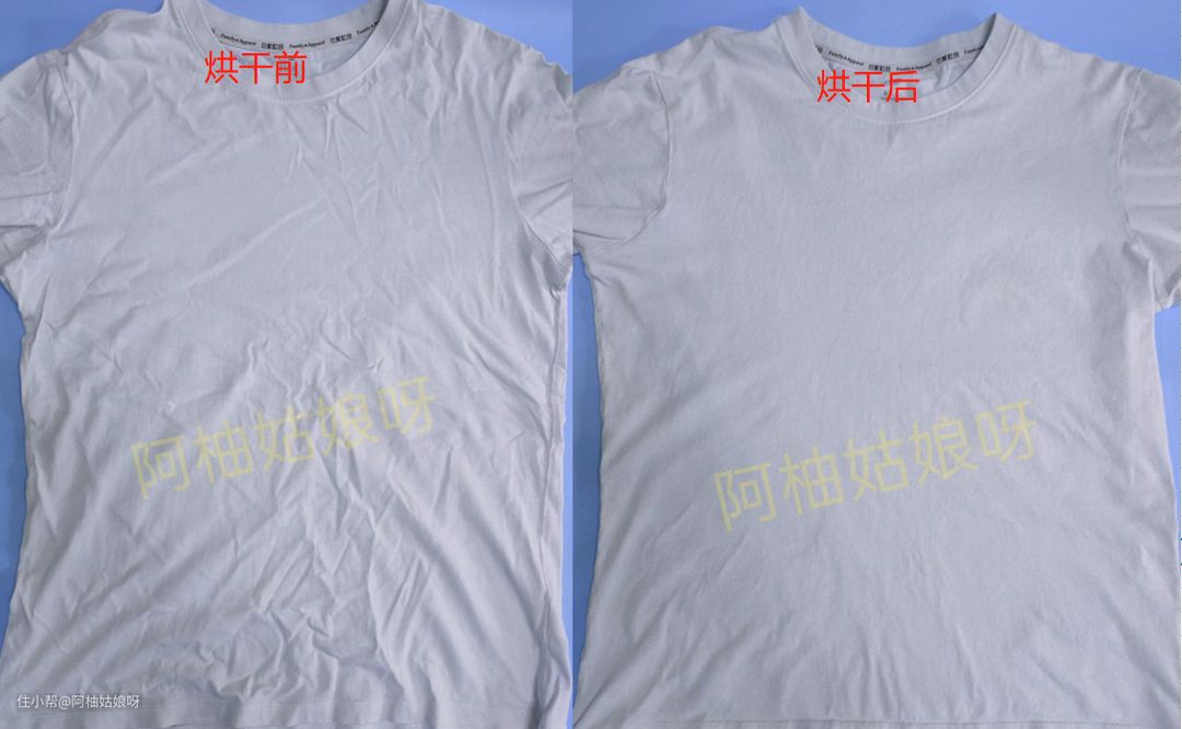 可以看到,这件放在衣柜多年的短袖拿出来时褶皱非常明显,如果穿着这件衣服逛街大概率会被人认为是不修边幅。而衣服完全浸湿脱水进行烘干之后,整体变得比较平整,和烘干前相比判若两样。而衣服下方皱起的是衣服变形所导致的,并不是烘干机的问题,大家可以忽视(手动狗头)。