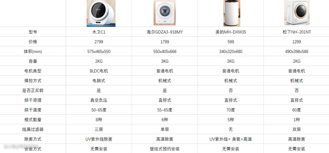 别着急,经过多番资料搜集,在小型烘干机为姊妹们选出了口碑较好的:木卫C1、海尔GDZA3-918MY、美的MH-DXW35和松下NH-201NT4款机型中供大家选择。为了让大家更加直观了解这四款机型的优劣点,我做了一个表格给大家参考,下面我就挑几点比较重要的参数进行分析。