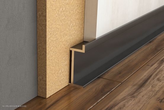 ②将下好尺寸的踢脚线上槽倾斜半挂在卡扣的上口,然后将踢脚线后端向上提起一点再贴墙面向下按,使卡扣上部凸卡完全进入踢脚线上部凹槽,同时轻拍踢脚线中部即可。安装时从