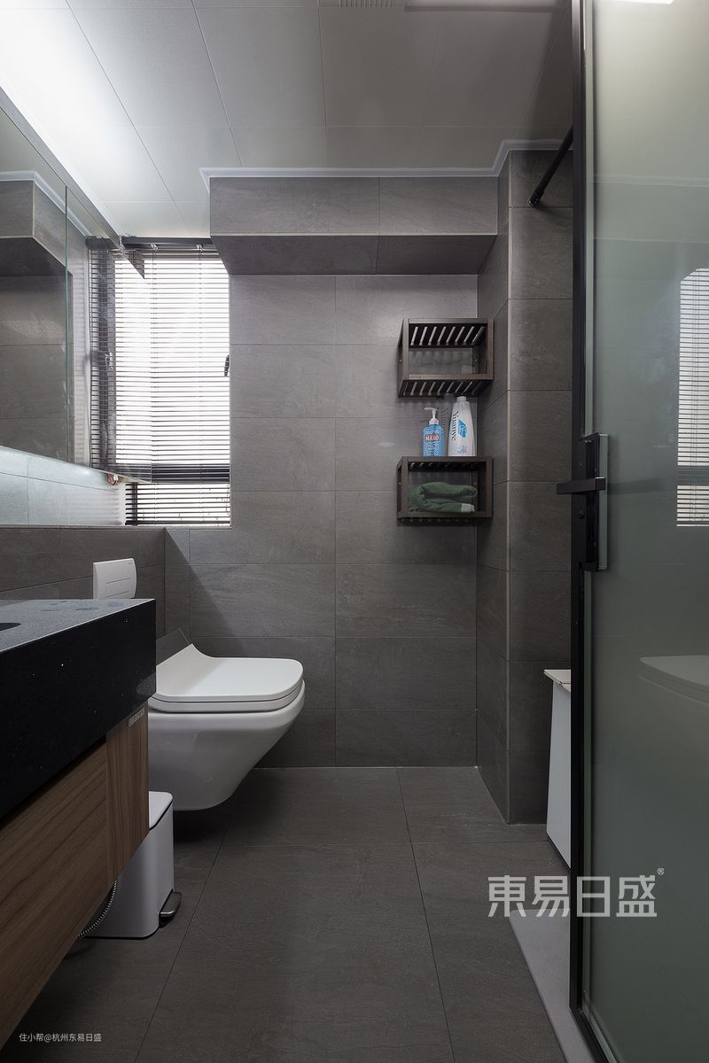 ◆纯白的马桶和浴室柜,配合灰色瓷砖,简约大方。