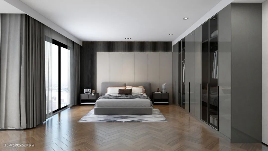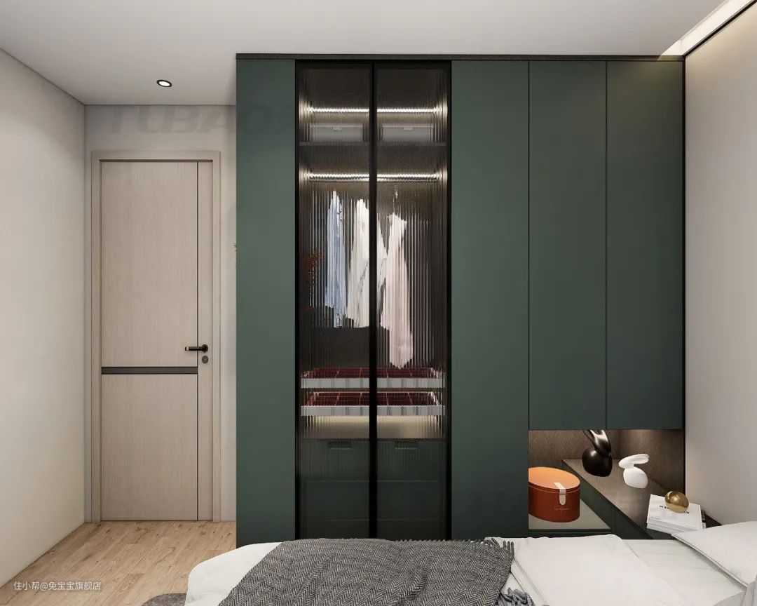 为了提升空间的通透感,衣柜不仅仅是玻璃柜门这么简单。床的摆放不再是按部就班,而是居中,是不是个性十足呢。