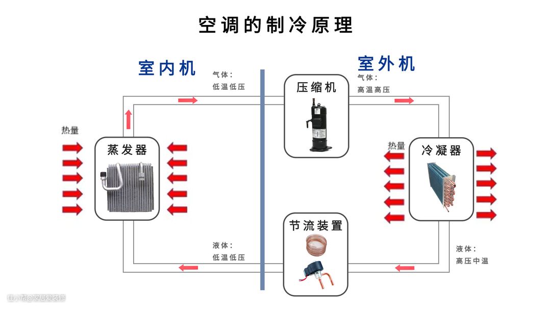 压缩机将低温低压的冷媒气体,变成高温高压的气体,然后通过冷凝器,将之变为液体。同时结合空调外机将热风吹出。高压的液体经过节流装置,进行降压,变成低温低压的液体。然后经过室内机的蒸发器,变成低温低压的气体,在此之间,由液体变为气体,需要吸收大量的热量,借助空调室内机的风扇,起到降温的作用。