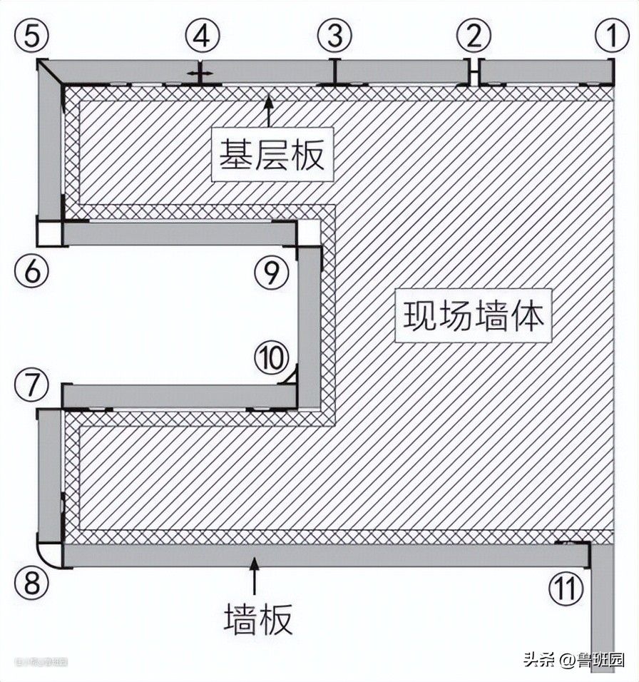 ⑤:Y字尖角,墙板45°切角后对角拼接;