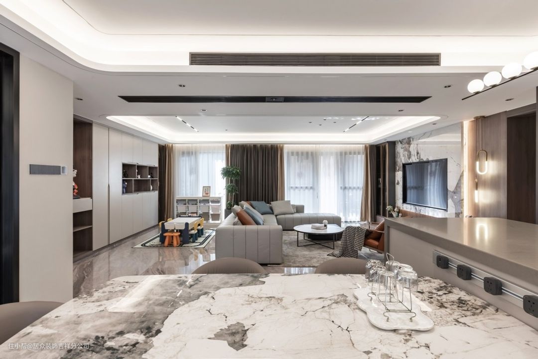 1、复杂的电视墙,岩板,石材,软包,这些都不要去做,它们不但价格贵,而且用上两年就看腻了,就刷个纯色的乳胶漆,然后安装投影幕布,越简单的也越显高级,轻松省下几千。