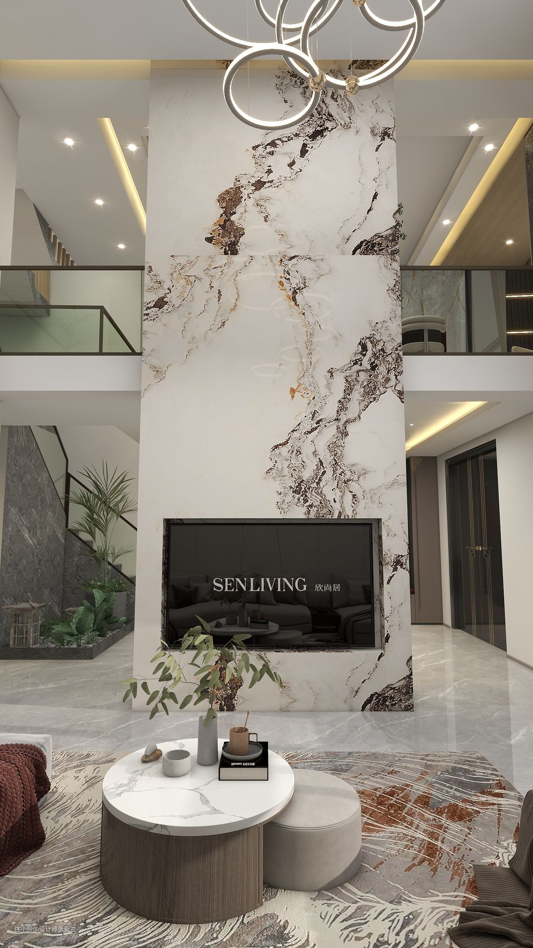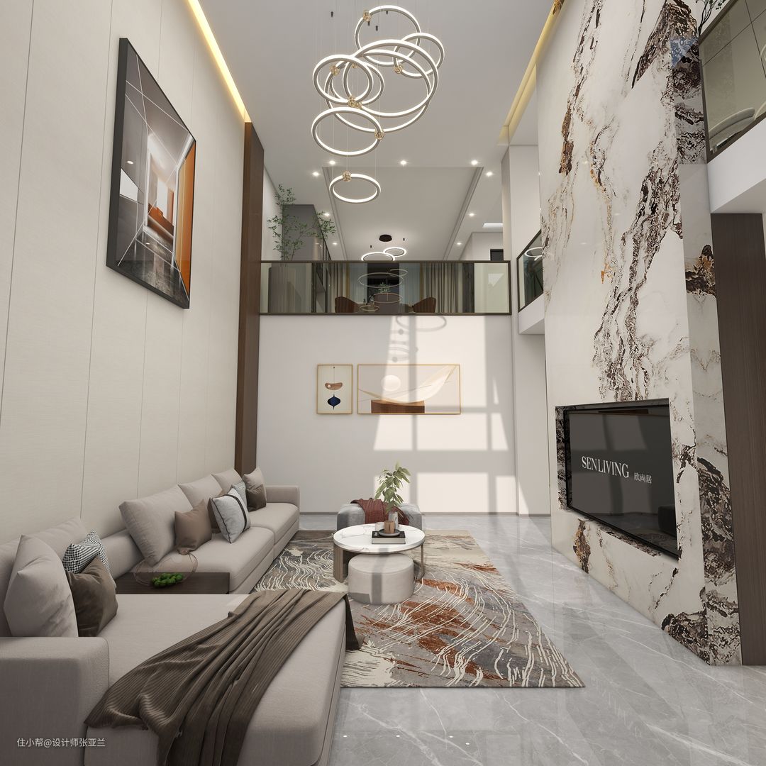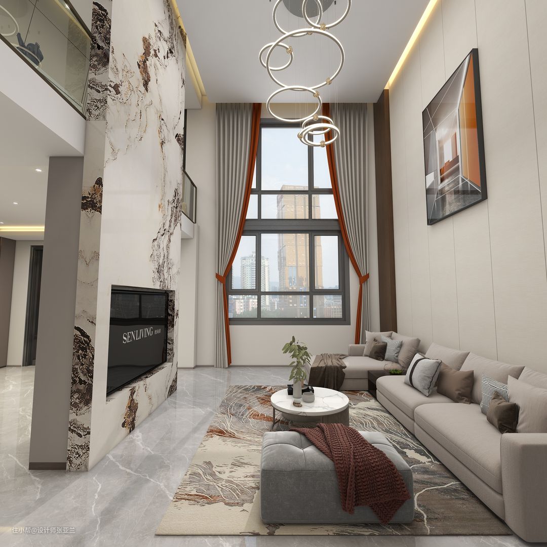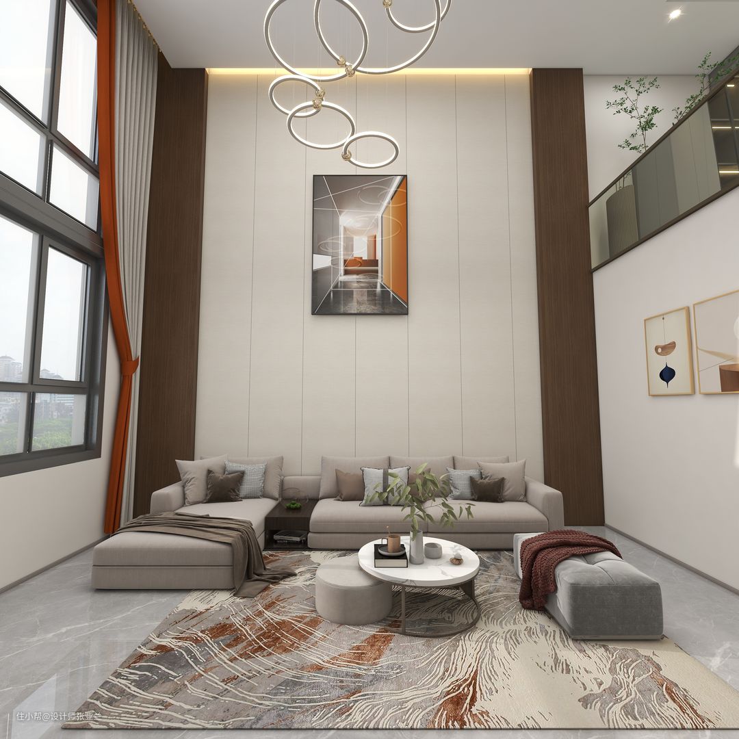 而客厅的上方没有楼板,是两层楼的高度。经设计师的精心设计在挑高客厅视觉效果上体现家居生活的品