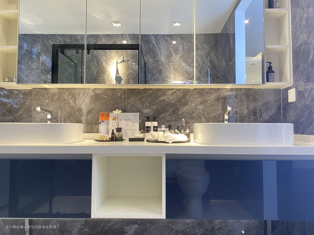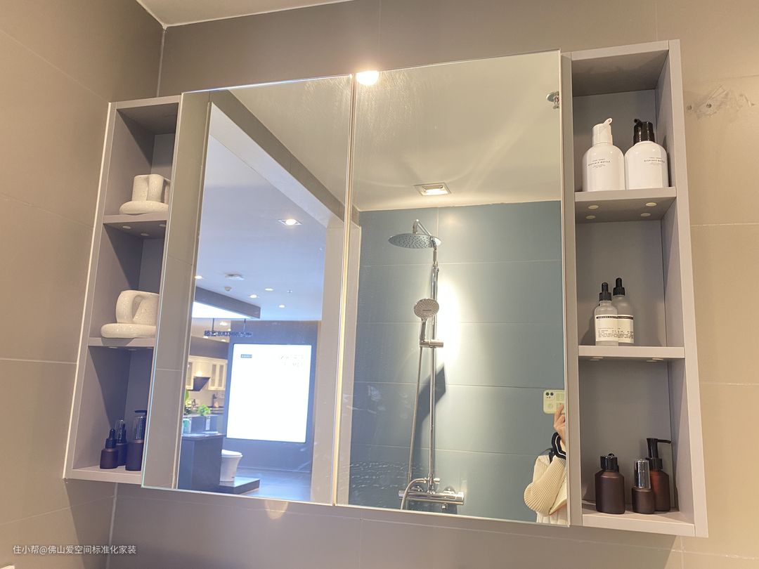 2.做一半是封闭一半是开放的镜柜,可以把卫生间的物品都收起来,比如:买多的洗发水、沐浴露、护发素和牙膏等等放在封闭的镜柜上,开放的部分我们就放每天要用的牙膏牙刷、刷牙杯与洗面奶等等;贵重的精华面霜放封闭处,以防小孩子打烂损失太多。