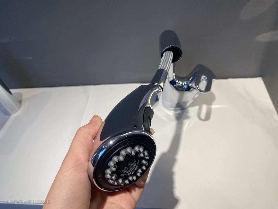 3.水龙头小爱疯狂建议使用抽拉式水龙头,清理台面很方便,边边角角都可以照顾到,水龙头款式一定要选向下流水的,不要选向上或者平流的,因为水很容易倒灌,会导致管道生锈的。