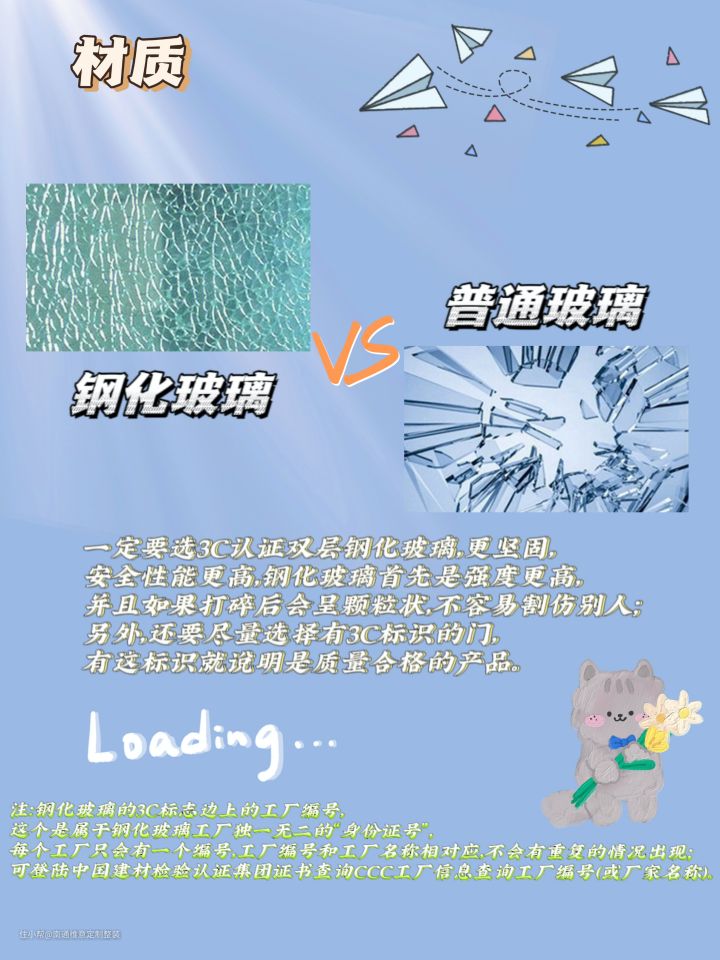 记住:一定要选3C认证双层钢化玻璃,更坚固,安全性能更高,钢化玻璃首先是强度更高,并且如果打碎后会呈颗粒状,不容易割伤别人;另外,还要尽量选择有3C标识的门,有这标识就说明是质量合格的产品。