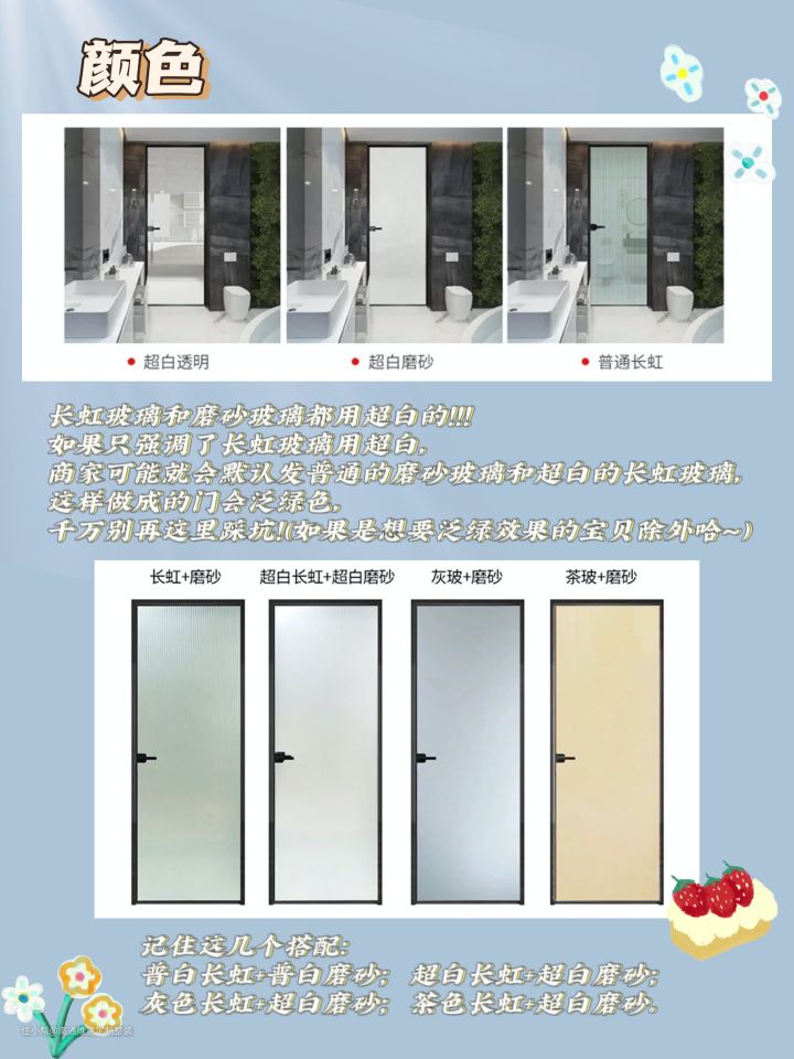 长虹玻璃和磨砂玻璃都用超白的!!!如果只强调了长虹玻璃用超白,商家可能就会默认发普通的磨砂玻璃和超白的长虹玻璃,这样做成的门会泛绿色,千万别再这里踩坑!(如果是想要泛绿效果的宝贝除外哈~)