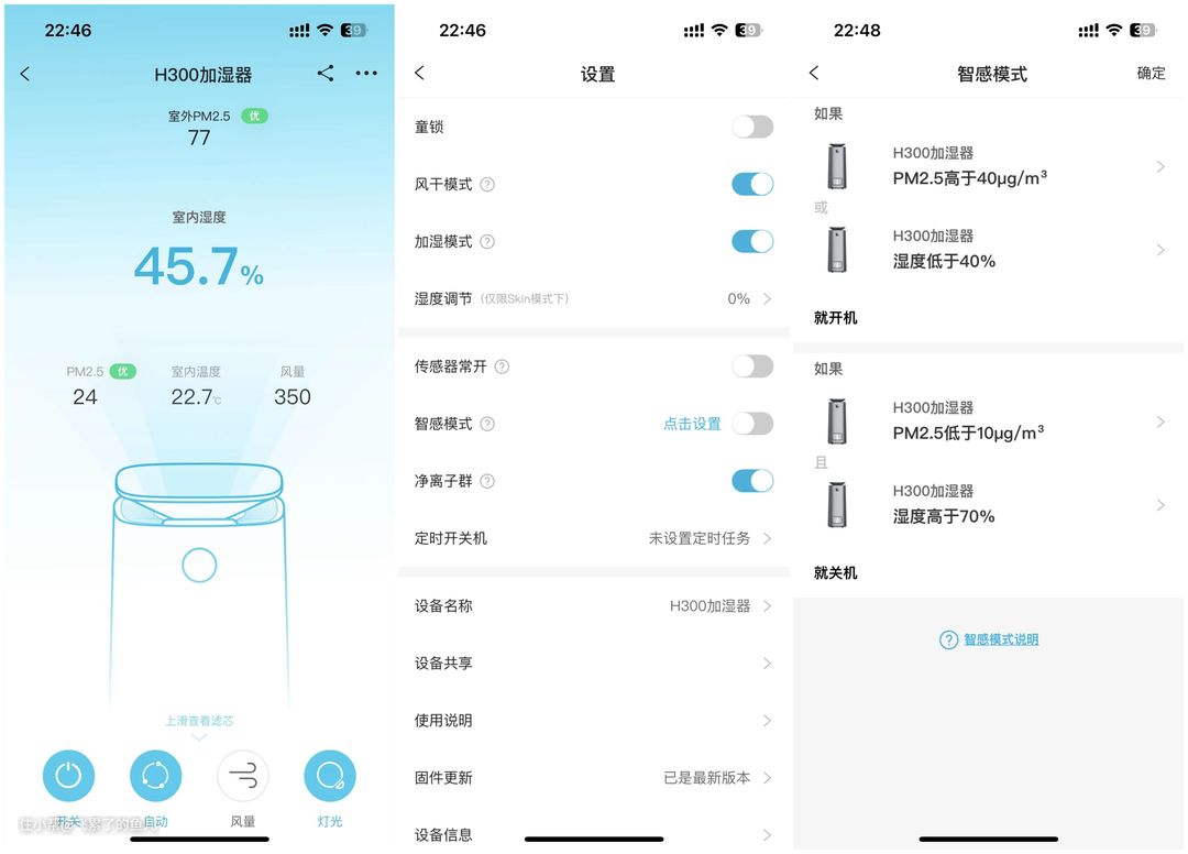 352 H300有三种模式,分别为自动、睡眠和Skin,其中自动模式锁定55%湿度;睡眠模式关闭灯光、低档运行;Skin模式则可以根据自身情况在70%湿度以内进行个性化设置。