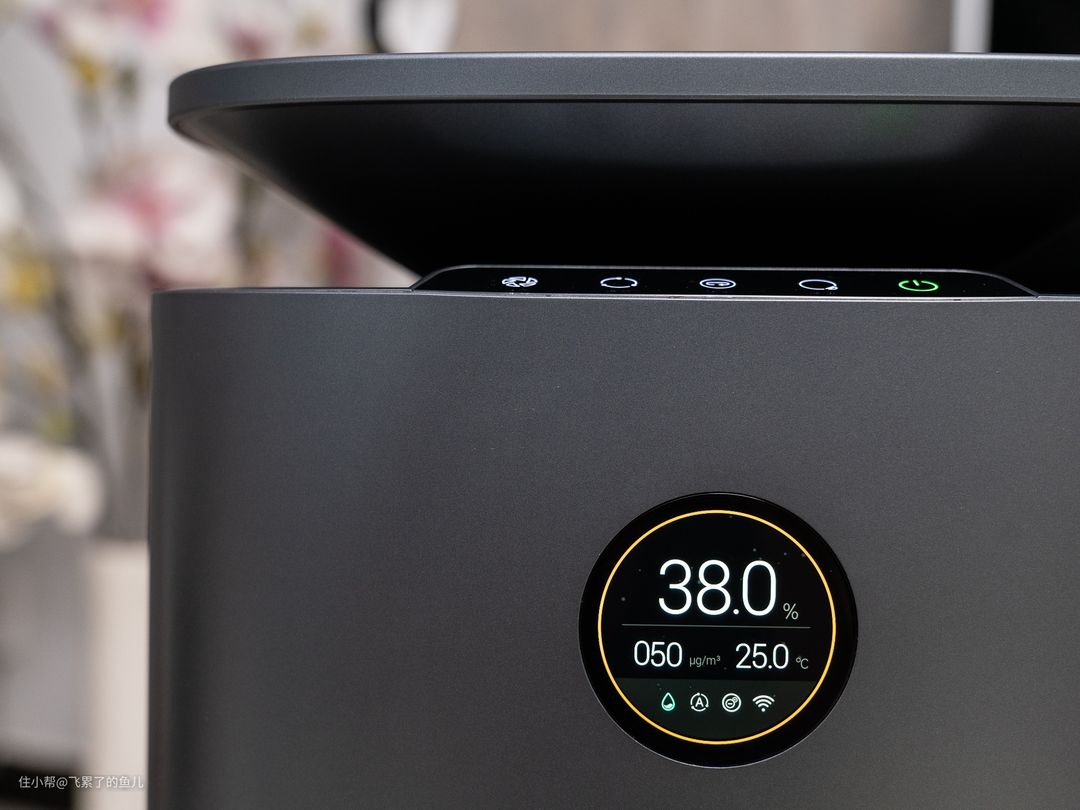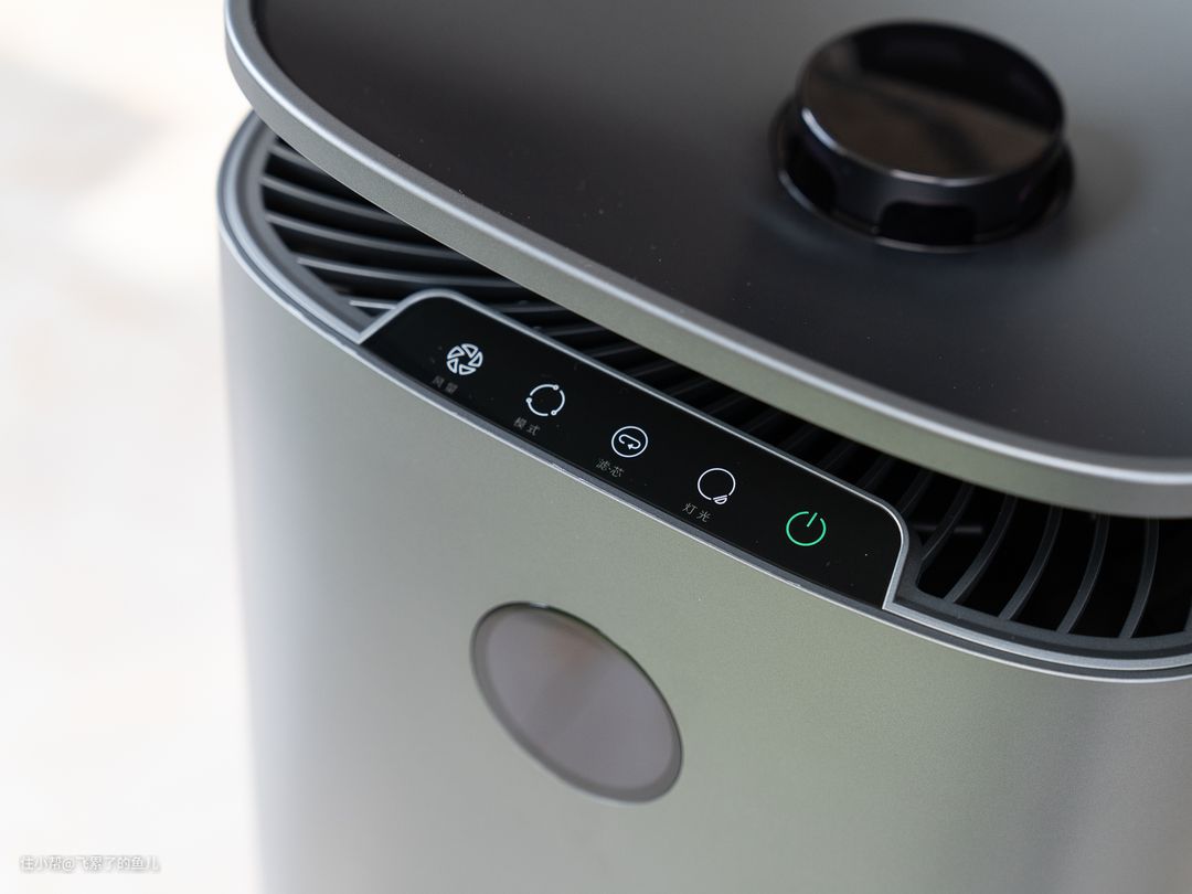 交互方面,机身设置了5颗触控按键(电源、灯光、滤芯、模式、风量)和一块圆形屏幕。