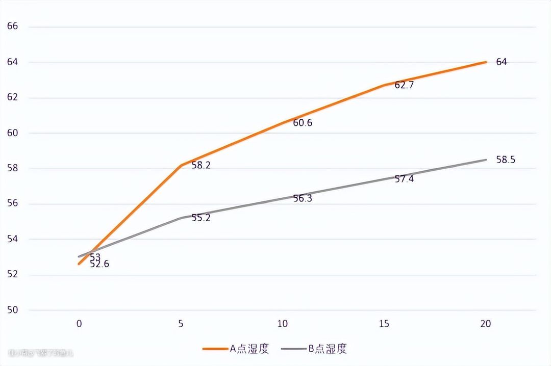 我把这20分钟内A、B两点的湿度变化做成了折线图。可以看到,离352 H300较近的A点,湿度提升非常猛,速度快、幅度大;相对来说,B点的湿度变化较为柔和,但是考虑到B点位置与H300有7-8m的距离,能在20分钟时间里实现5%+的湿度提升,也是相当给力的!