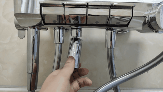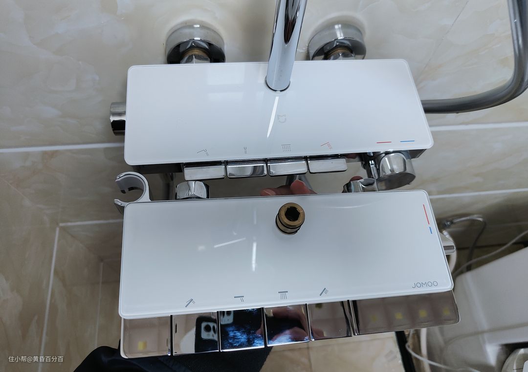 布局上,米家花洒将冷热旋钮放在了前侧,靠近琴键开关,而九牧花洒则放在了右侧,具体放在哪里顺手因人而异,我个人是习惯了放在前侧的,毕竟之前的花洒冷热旋钮就在前侧。