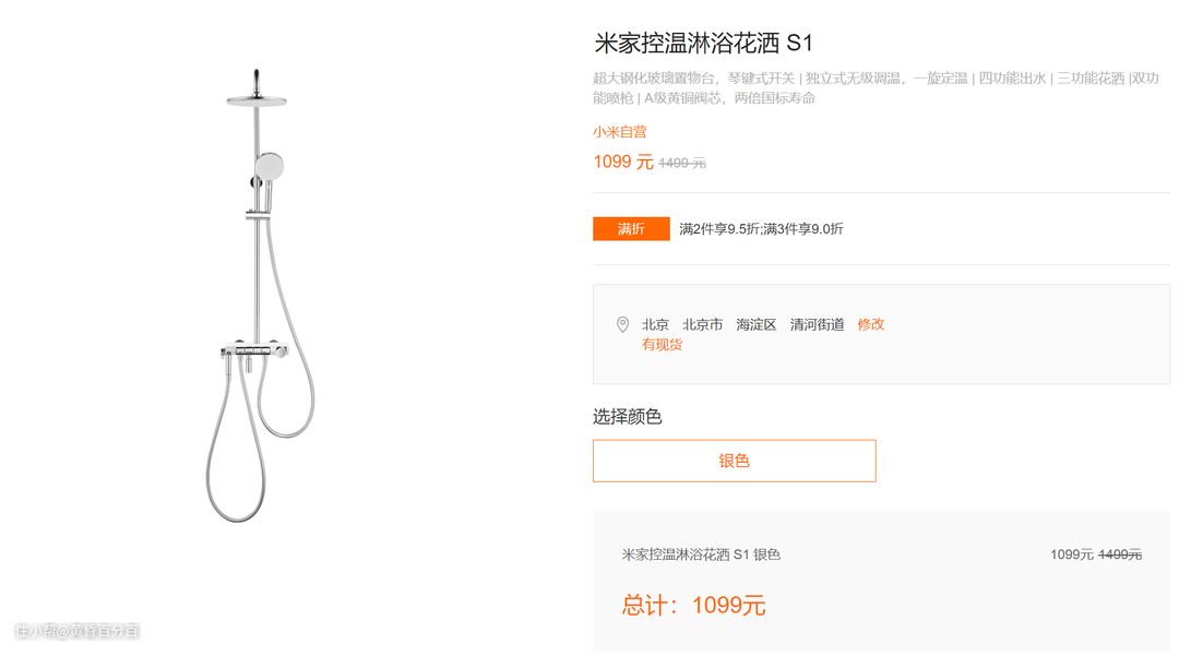 互联网品牌的花洒,我选择的使米家的控温淋浴花洒S1,小米有品售价1099元。