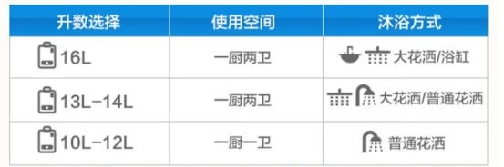 由于燃气热水器是即开即用的,升数主要由同时用水量的多少决定。我们平时一个花洒的出水量一般在6升/分钟左右,水龙头的出水量在7升/分钟,如果是一个厨房一个卫生间,选择14升以上的燃气热水器会更合适,如果你家里是复式楼/别墅,卫生间比较多,那么选择20L以上的燃气热水器也是可以的。