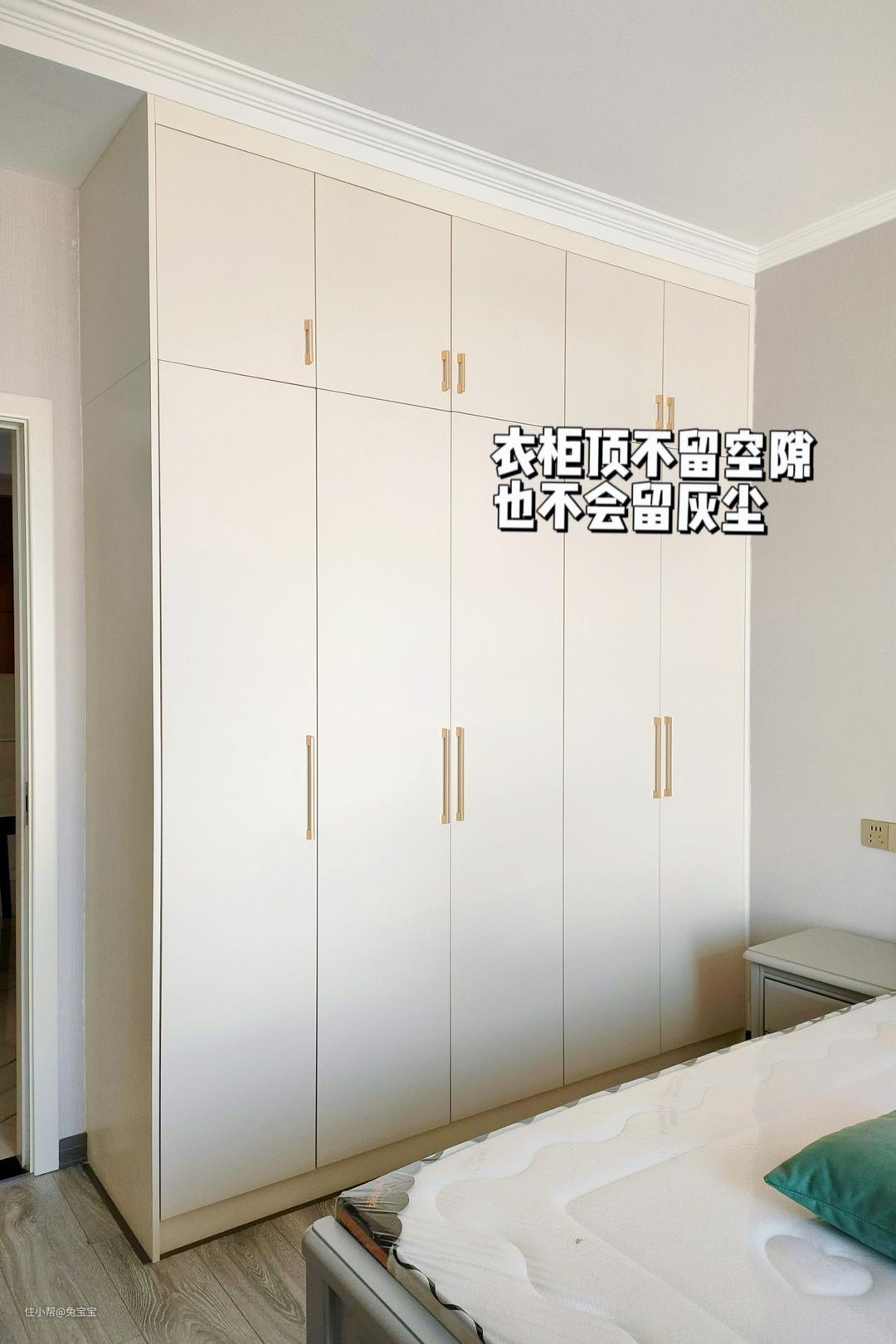 卧室布局:主卧室的衣柜一顶到头,上面没有空隙,日常打扫起来也很方便,而且金色把手加上奶白色的柜子,简直是太好看啦!