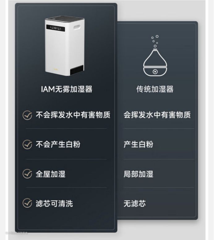 同价位还有IAM 无雾加湿器,700mL/h的加湿量和最低30dB的睡眠档噪音对于大面积的需求来说是相当不错的。不过由于只有银离子抑菌,整体抑菌效果不如紫外线杀菌,对于睡眠噪音比较敏感的朋友们可以选择,之后记得勤刷水箱。