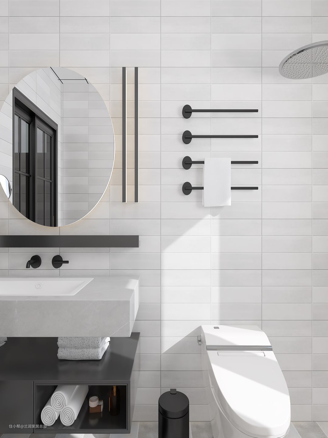 但是在中间需要浅色的腰线或底部浅色的踢脚砖,这不会使整个墙看起来太闷;地砖颜色可供选择与墙砖相同的颜色,但必须使用浅色系清洁材料的颜色才能显得尊贵大气。