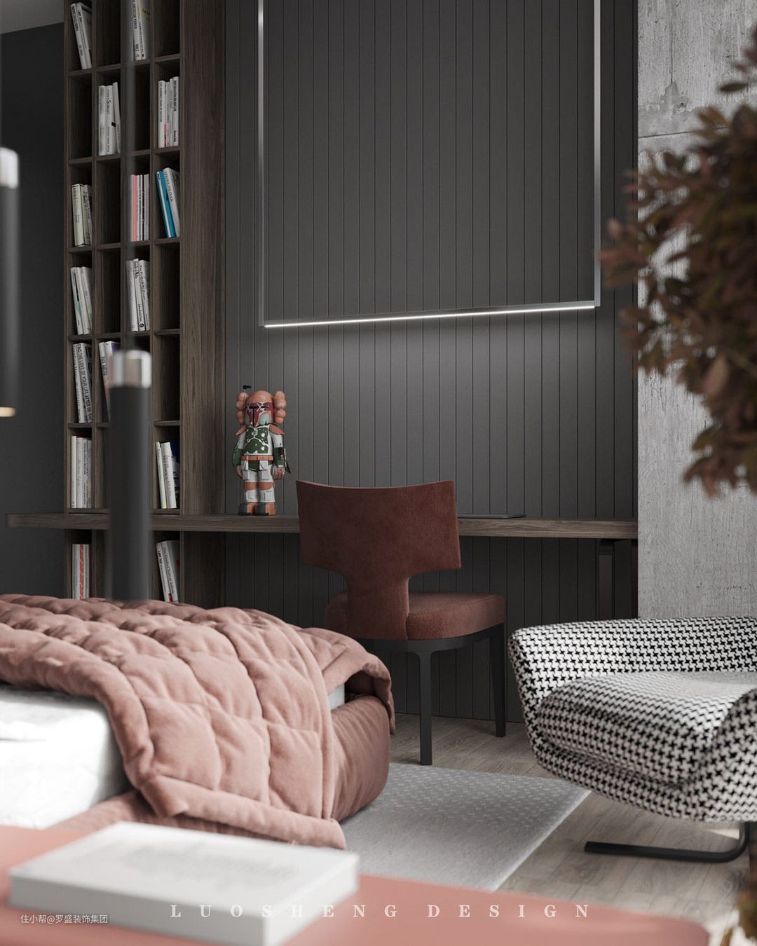棕色软垫床与灰色空间简直绝配,同时木制嵌入式书柜为日常阅读提供温床,而延伸的书桌设计将阅读区域与空间完美融合,同时又彼此独立。