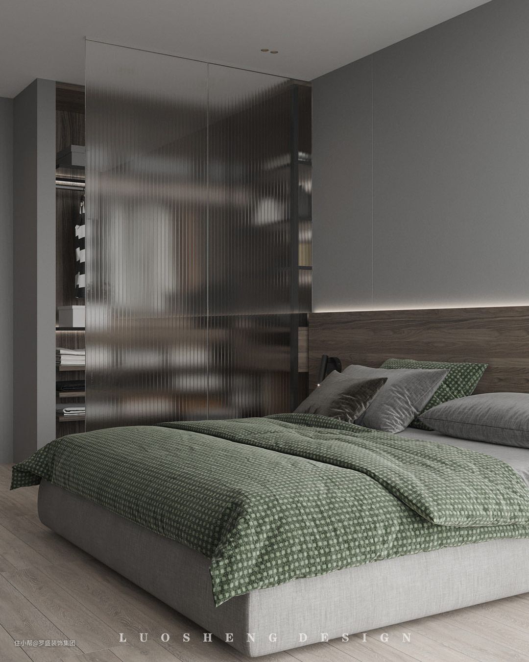 偏灰色的空间使人放下疲惫,睡眠质量也会更好,淡色的绿植可以温养一天的好心情。