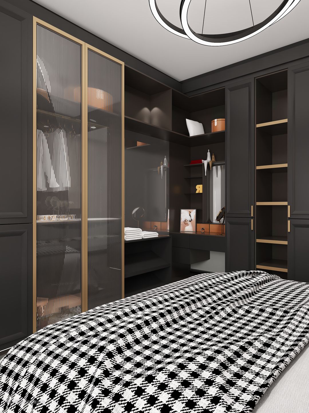 如果小户型衣柜的空间更大,则橱柜的大小可以分为长短层,并且可以接受不同的衣服;如果您需要更多的服装风格,则可以在左右两侧设置小型公寓式衣柜。