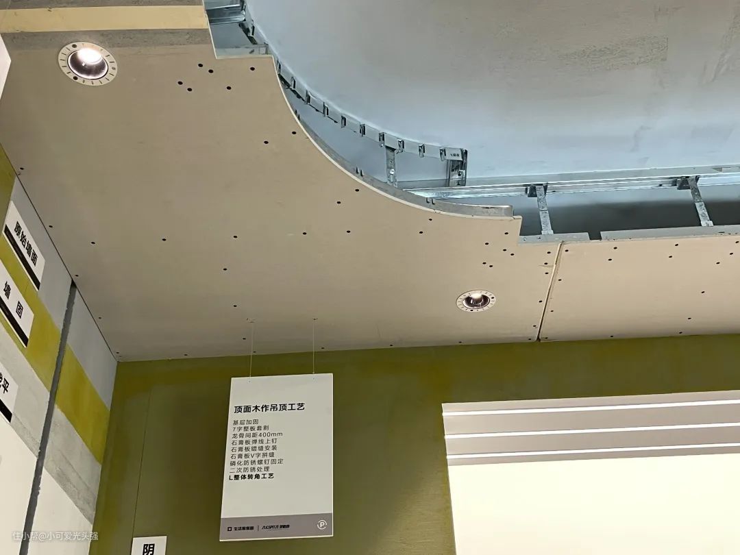 木工阶段:木工的主要施工项目有吊顶龙骨架设、木质门窗制作、木质柜体家具制作、电视背景墙造型等,需要注意玄关吊顶,带有大梁的玄关,须采用穿梁底吊顶工艺,或者吊顶标高高于梁底,吊顶高于梁底部分贴石膏线,避免与梁底齐平,因石膏板与梁体材质不一样,热胀冷缩程度不同,后期容易产生裂缝,避免不必要的售后维修。这里需要注意龙骨间距的大小:吊杆间距必须小于1200mm,副龙骨间距400mm。