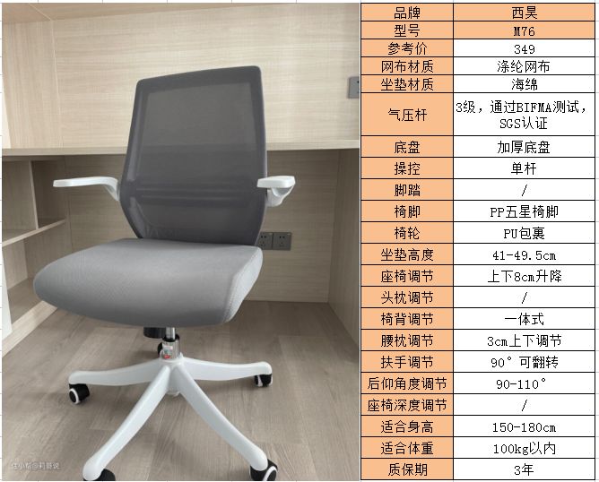 推荐理由:西昊M76是一款价格非常便宜的电脑椅,使用的是通过SGS认证的3级气压棒、加厚底盘、PP材质的五星椅脚、PU静音轮,滚轮噪音小,不伤地板;可以对座椅高度、腰枕、后仰角度、扶手进行一些基础调节,特别是可翻转扶手设计,不用的时候可以推到电脑桌底下,节省室内空间,特别适合学生宿舍和会议室使用。