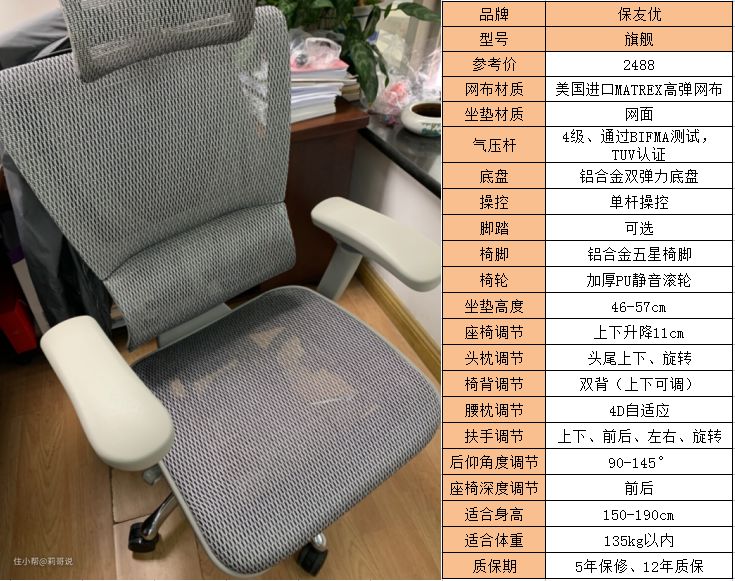 保友优b升级后的7d坐感,10区支撑,对我们的颈部和腰部的承托效果非常好;6D自适应腰枕可以自动适配各种坐姿,自动给你撑腰;5点移动支撑,可以缓解肩部、背部、腰肌劳损等问题;头枕、扶手等部位都可以灵活调节,特别好用;美国matrex高弹网布,回弹性好,更透气;铝合金脚,加厚PU静音滑轮都非常好用;推荐大家尽早购买。