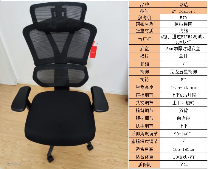 推荐理由:京造Z7 Comfort是京东京造推出的入门级人体工学椅,使用了TUV认证的4级气压棒和3mm加厚防爆底盘,在同级别座椅中算是为数不多的厂家,也说明京东也充分认识到了用户对爆JU有着深深的恐惧。椅背也是同价位座椅中难得的双背设计,在其他方面的用料就比较一般,座椅调节方面的功能也比较弱。