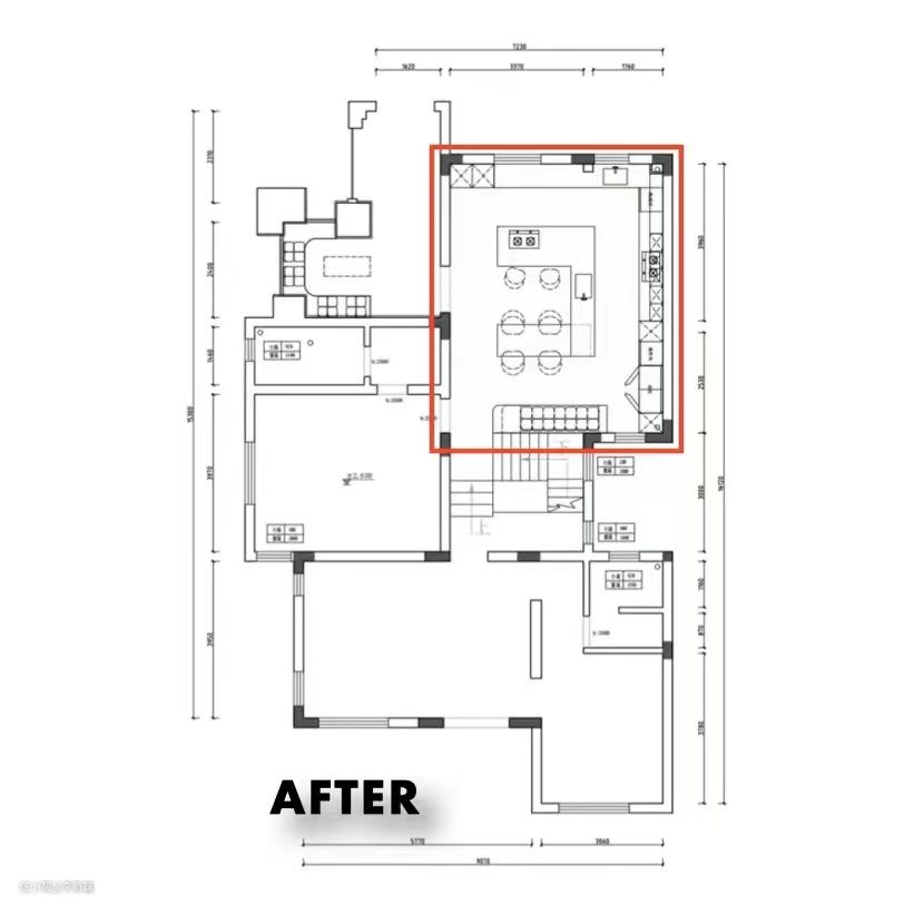原本户型功能分区很明确,中厨、西厨、餐厅各自为政,对于正常家庭来说完全够用,但是结合冯伟老师对厨房的需求,目前的厨房是很难满足要求的。