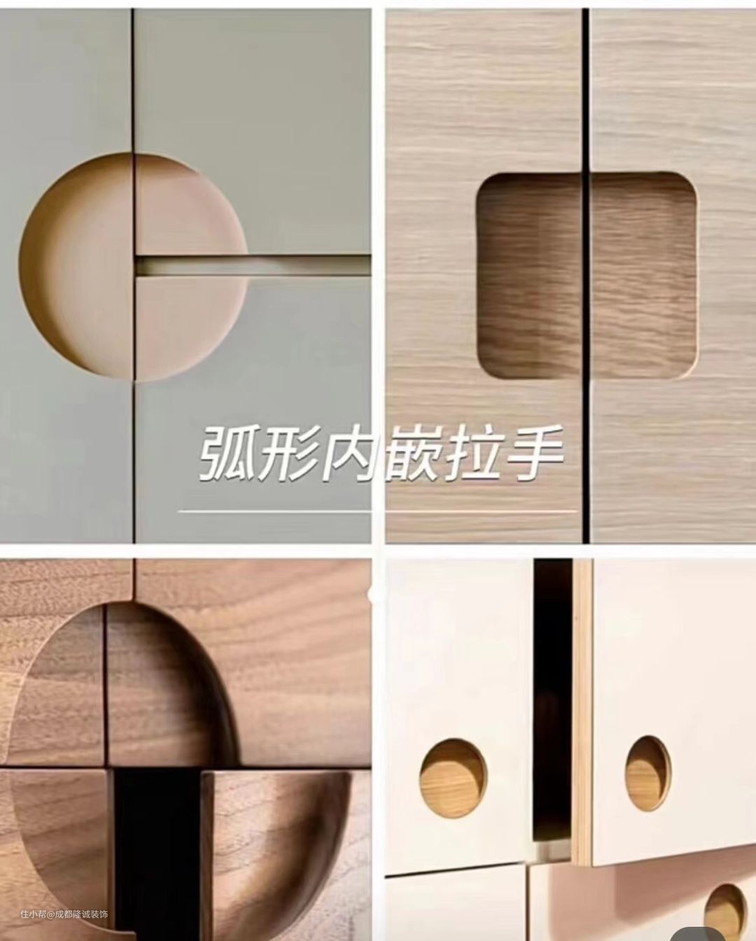 造型多样,既美观又有艺术设计感,使用的时候只需要把手指置于槽位之间,轻轻一拉就可以实现开关柜门,与门板铣槽效果很类似;但需要注意一点的就是清洁问题,凹槽里容易积灰尘,且位置面积狭小,难打扫。