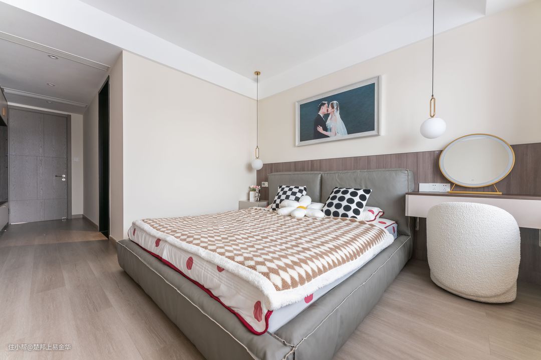 无主灯设计,视觉上房间整体空间更加宽阔了,也不担心照明的问题,房间充满氛围感,精致的床头灯展现了一种对称的美,富有造型感。