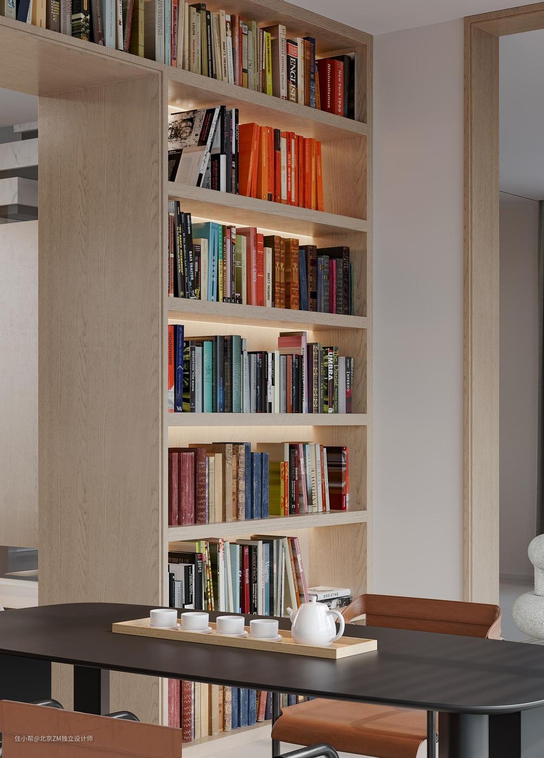书籍的摆放保证了各个区域之间的活动自由,缓解了整墙柜子的压抑感。