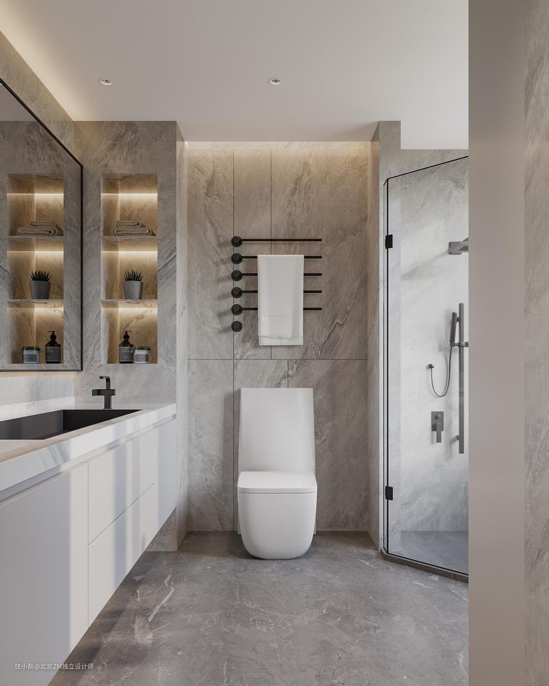 卫生间做到干湿分离,防止水蒸气损坏其他配置。大理石的百搭耐脏,搭配地面的灰色理石,减少压抑感。整体洗浴期间视觉区分,整体上不会过于沉闷。